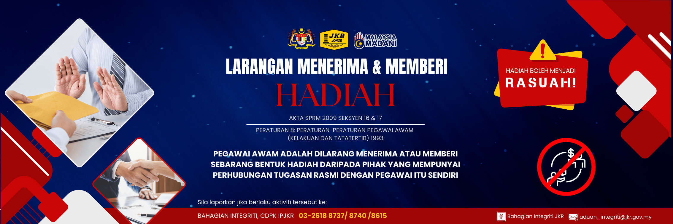 Jabatan Kerja Raya Johor tidak bertanggungjawab terhadap sebarang kehilangan atau kerosakan yang dialami kerana menggunakan maklumat dalam laman ini.